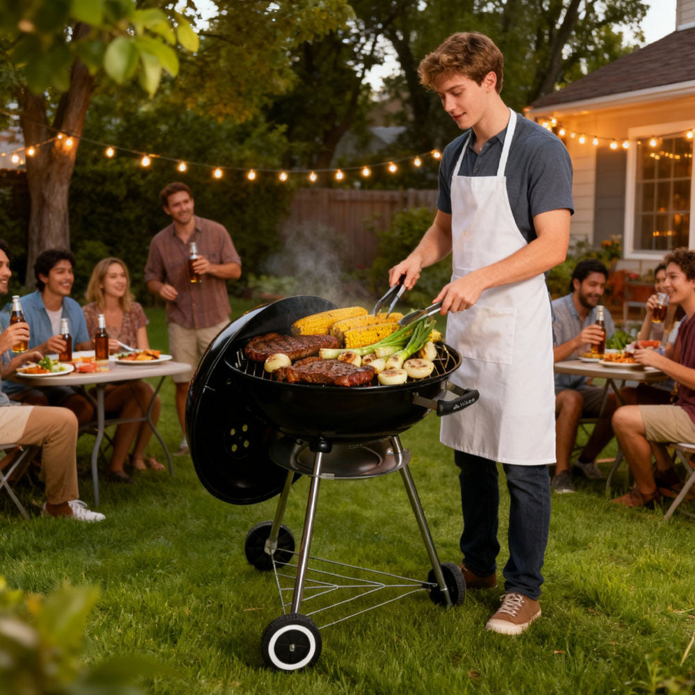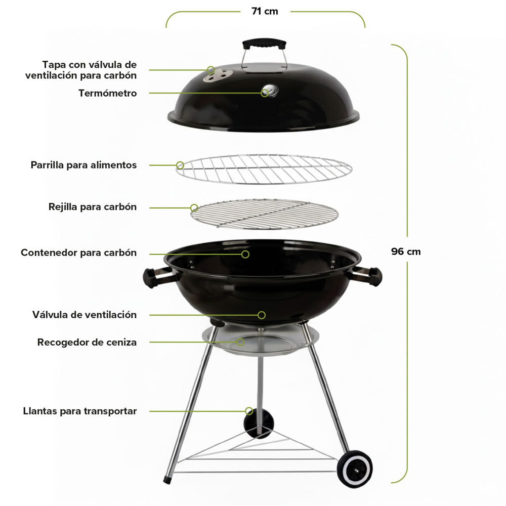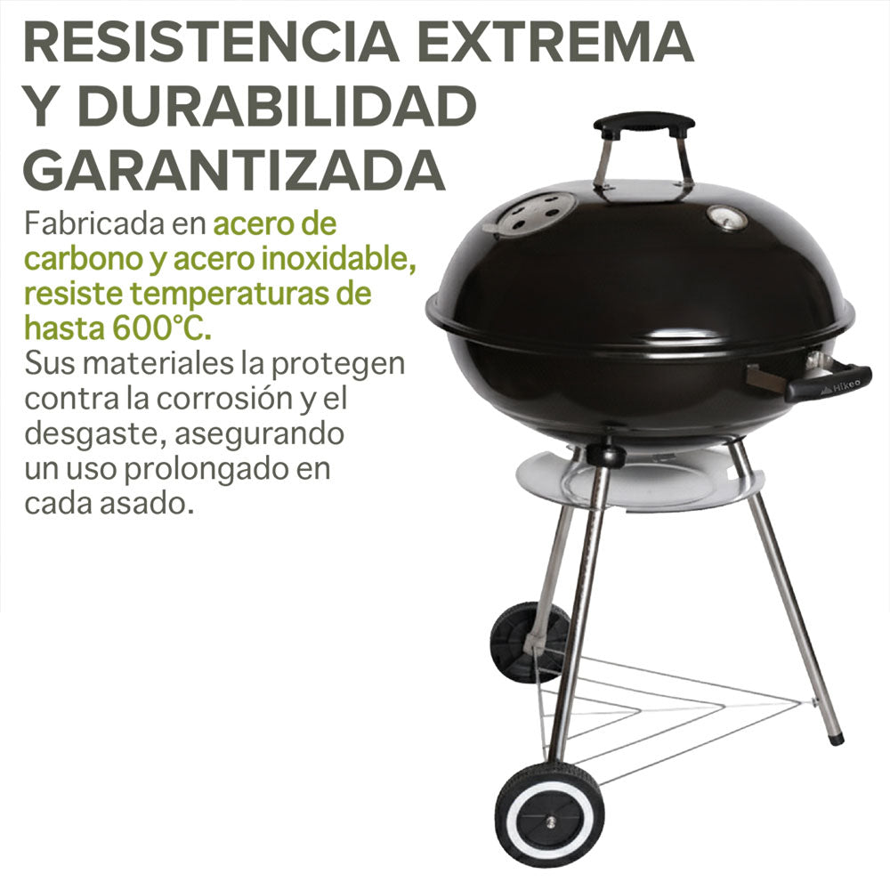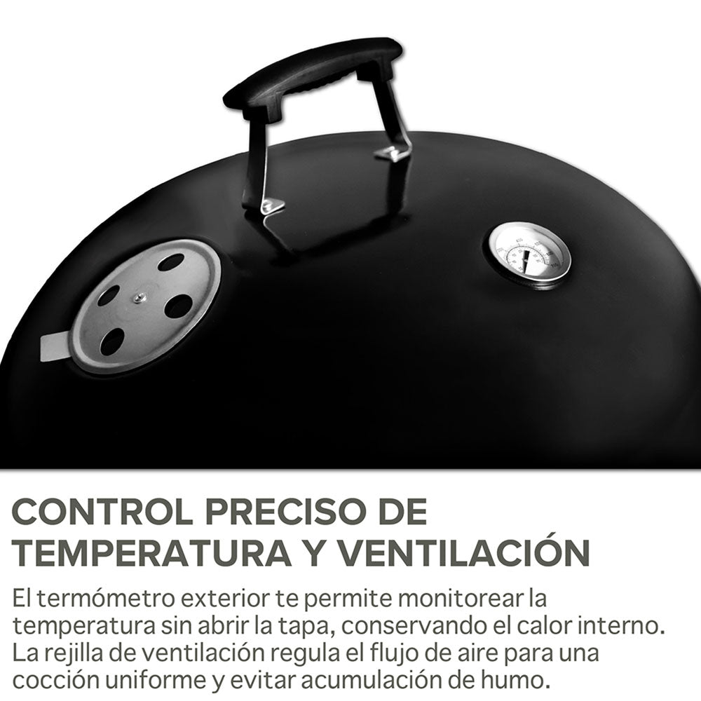 Disfruta el auténtico sabor al carbón y carnes jugosas con este asador. Su amplia parrilla de 55 cm te permite cocinar varios cortes a la vez, mientras el termómetro y la ventilación te dan control total del calor. Con doble rejilla, ruedas para transportarlo y materiales resistentes, es duradero y perfecto para reuniones en el jardín, terraza o camping.