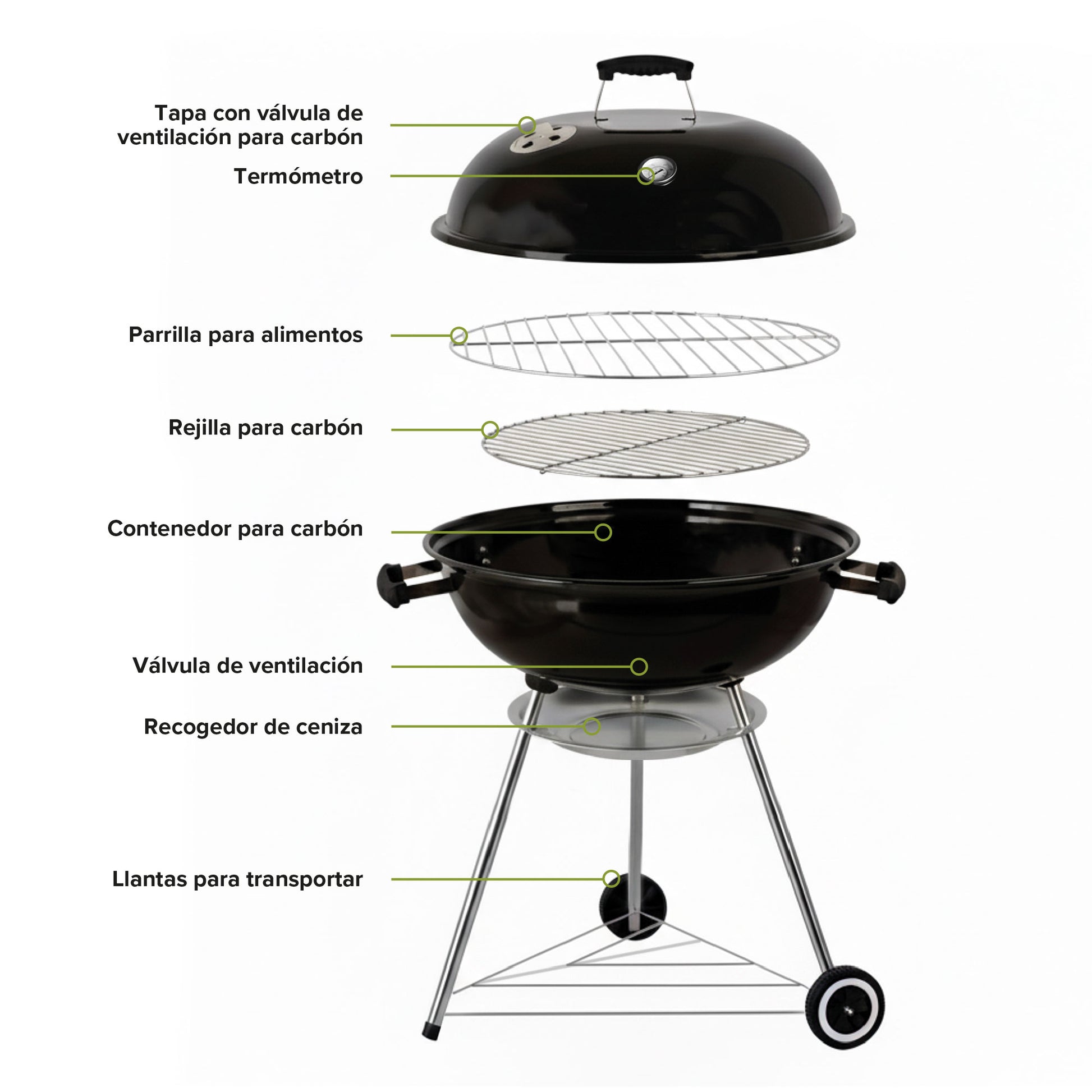 FÁCIL DE LIMPIAR: Una vez que termines de usar el asador, espera a que se enfríe, retira las rejillas, el carbón y vacía las cenizas. Lava con agua y jabón para eliminar los residuos y quedará listo para tu próxima parrillada.