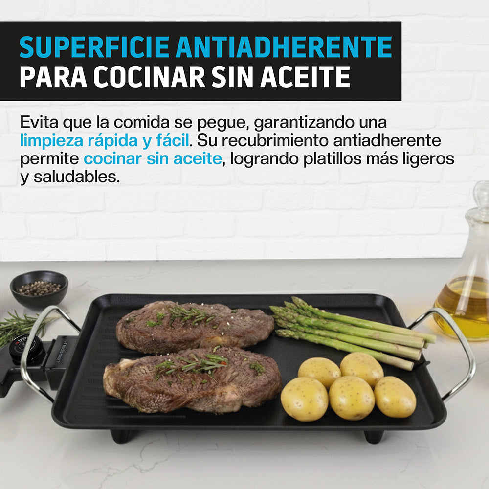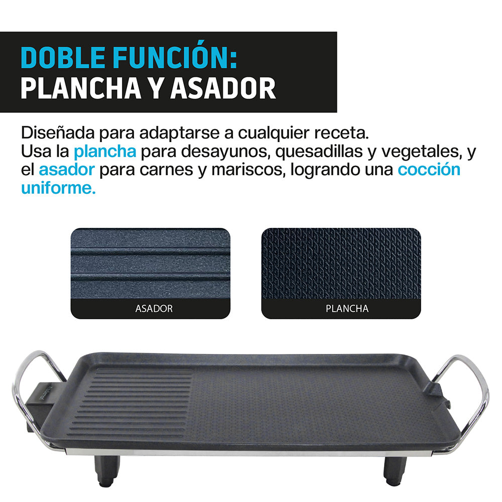SÓLO CONÉCTALO A LA CORRIENTE Y ESTÁ LISTO EN SEGUNDOS: Amplia superficie que permite utilizar el lado de asador y plancha a la vez. Cocina huevos, quesadillas o verduras en la parte plana, mientras sellas carne o pollo en el lado tipo grill. Ideal para desayunos familiares o cenas completas