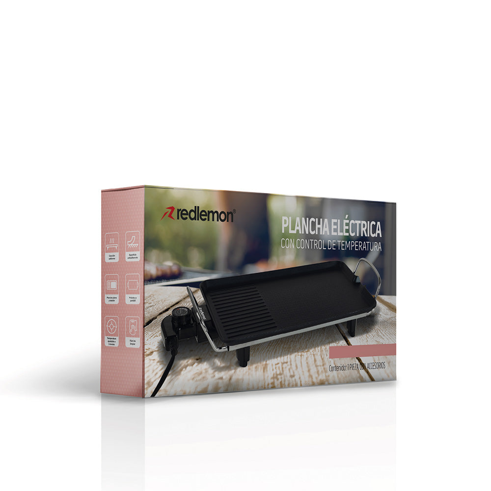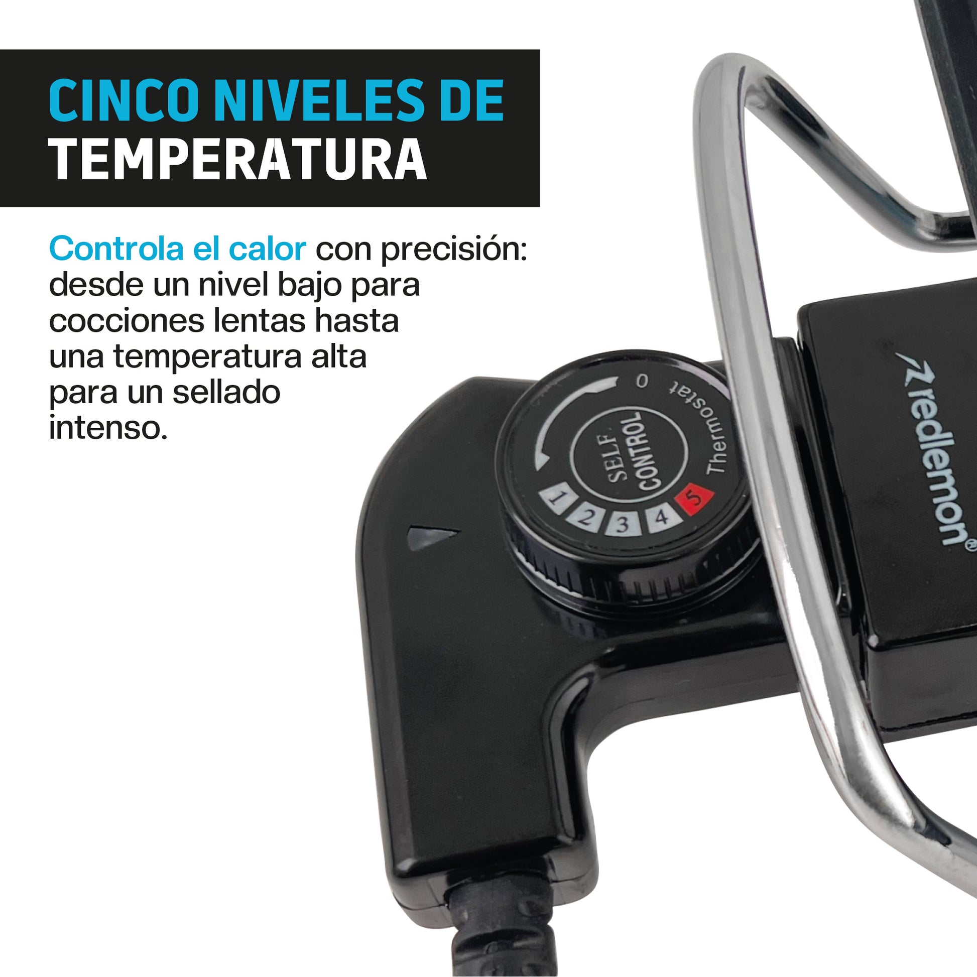 TERMOSTATO AJUSTABLE CON 5 NIVELES DE TEMPERATURA (115°C a 210°C): Control preciso del calor para todo tipo de preparaciones. La plancha distribuye la temperatura de forma uniforme, evitando zonas frías o quemadas y logrando cocciones doradas al punto