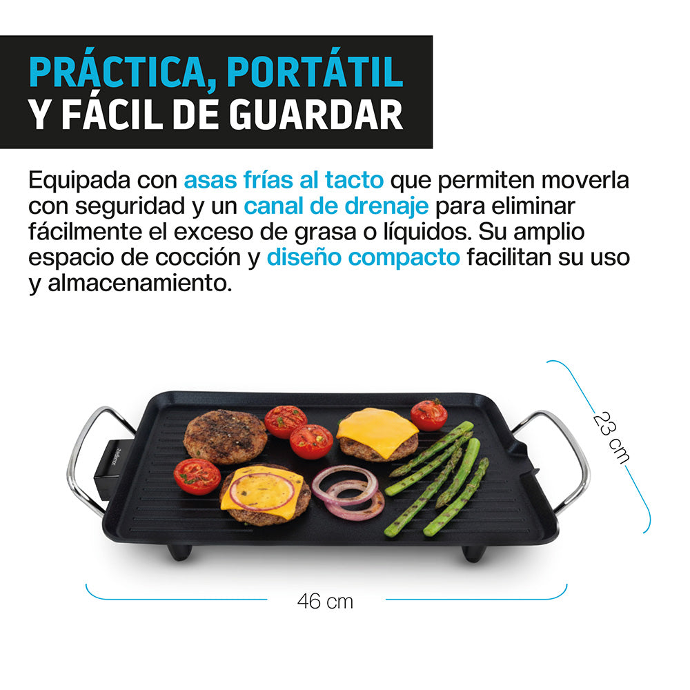 RANURA DE DRENAJE PARA FACILITAR ELIMINAR LOS DESECHOS: Usa sólo una pequeña cantidad de aceite líquido o en aerosol sobre la plancha eléctrica y disfruta comidas más saludables sin que los alimentos se peguen. Su práctico ducto elimina el exceso de grasa y jugos, logrando platillos ligeros y manteniendo su sabor