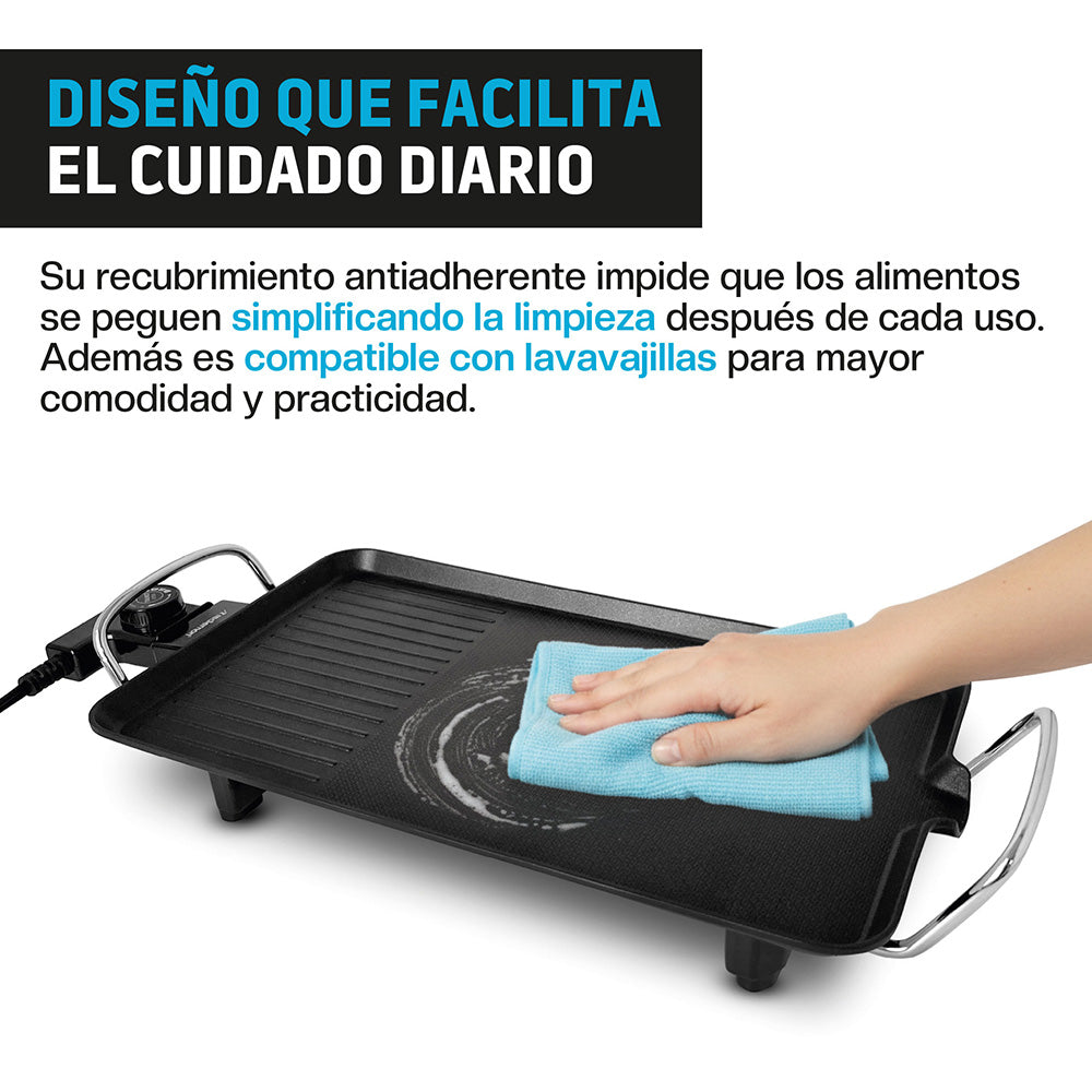 PLANCHA DE FÁCIL LIMPIEZA Y MANTENIMIENTO: Su bandeja desmontable puede lavarse en el lavavajillas, y la parte exterior con un paño suave y húmedo. Para mantenerla en buen estado, después de cada lavado y cuando esté seca, cubre la superficie de la bandeja con una capa de aceite de oliva, margarina o mantequilla para curarla.