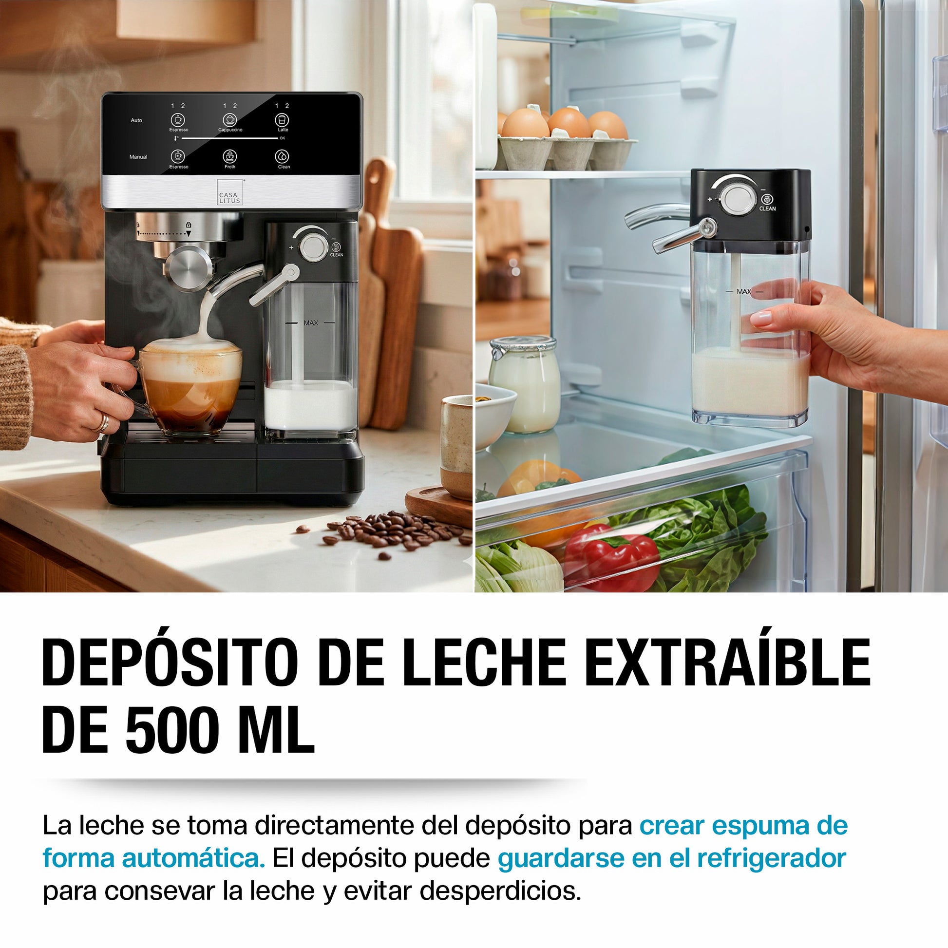 ● ESPUMADOR DE LECHE CON DEPÓSITO DESMONTABLE DE 500 ML PARA GUARDAR EN EL REFRIGERADOR: Logra cappuccinos y lattes perfectos con el sistema de espumado automático. La máquina toma la leche directamente del depósito y la espuma a tu gusto para lograr una textura cremosa y uniforme. El depósito extraíble puede guardarse en el refrigerador para conservar la leche y evitar desperdicios