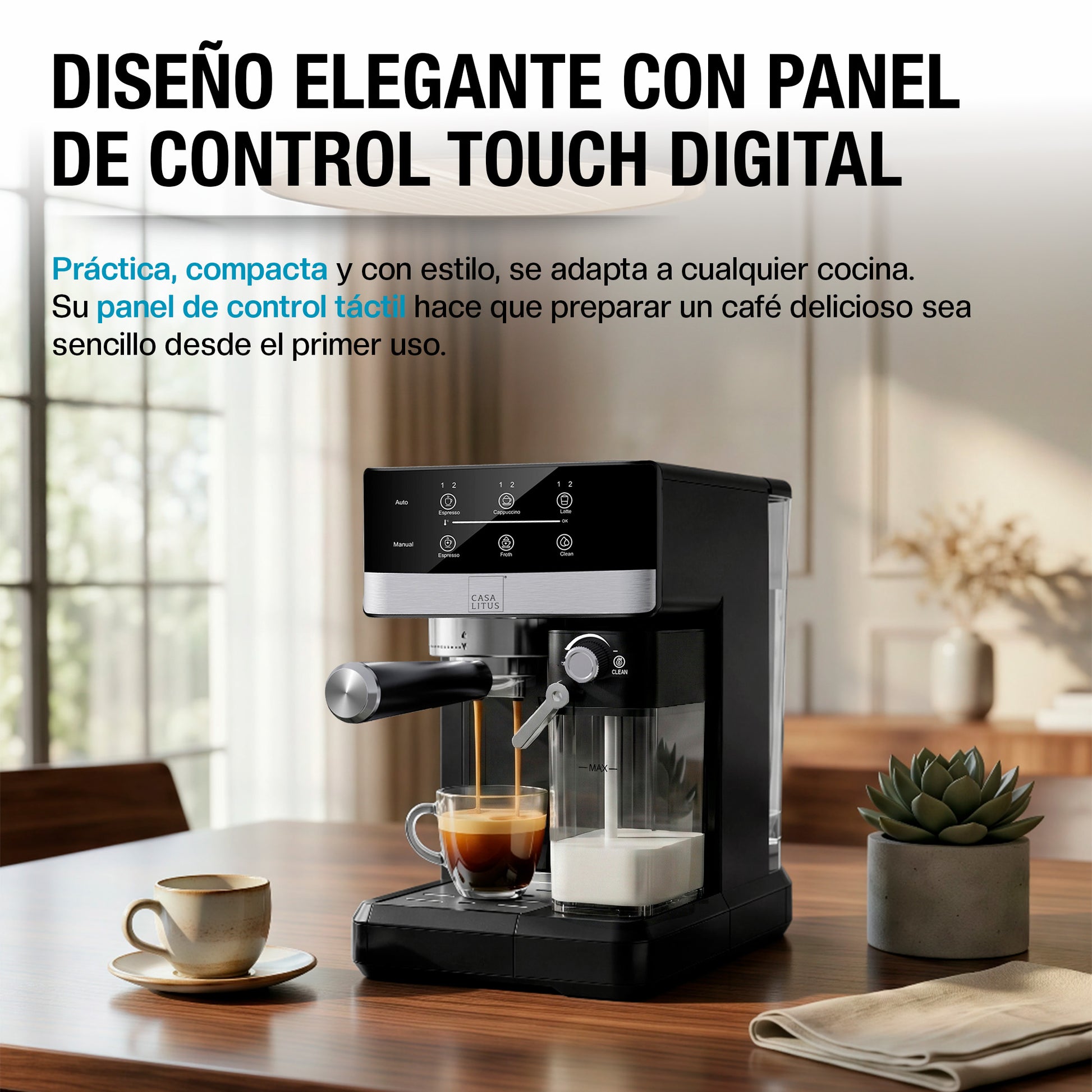 ● PANEL DIGITAL TOUCH CON MODOS AUTOMÁTICO Y MANUAL: Prepara fácilmente una o dos tazas de espresso, cappuccino o latte con solo presionar un botón. Las funciones automáticas son ideales cuando buscas un café rápido y de calidad, mientras que el modo manual permite ajustar la cantidad de café, leche y espuma para personalizar cada bebida