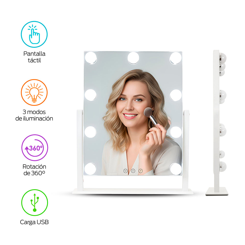 ILUMINACIÓN ESPECTACULAR TIPO HOLLYWOOD CON CONTROL TÁCTIL: El espejo posee 9 lámparas con un total de 54 luces led que brindan una mayor iluminación al momento de maquillarte para que no pierdas ningún detalle. Cuenta con una pantalla táctil que te permite encender y apagar la luz, cambiar su color y ajustar la intensidad del brillo