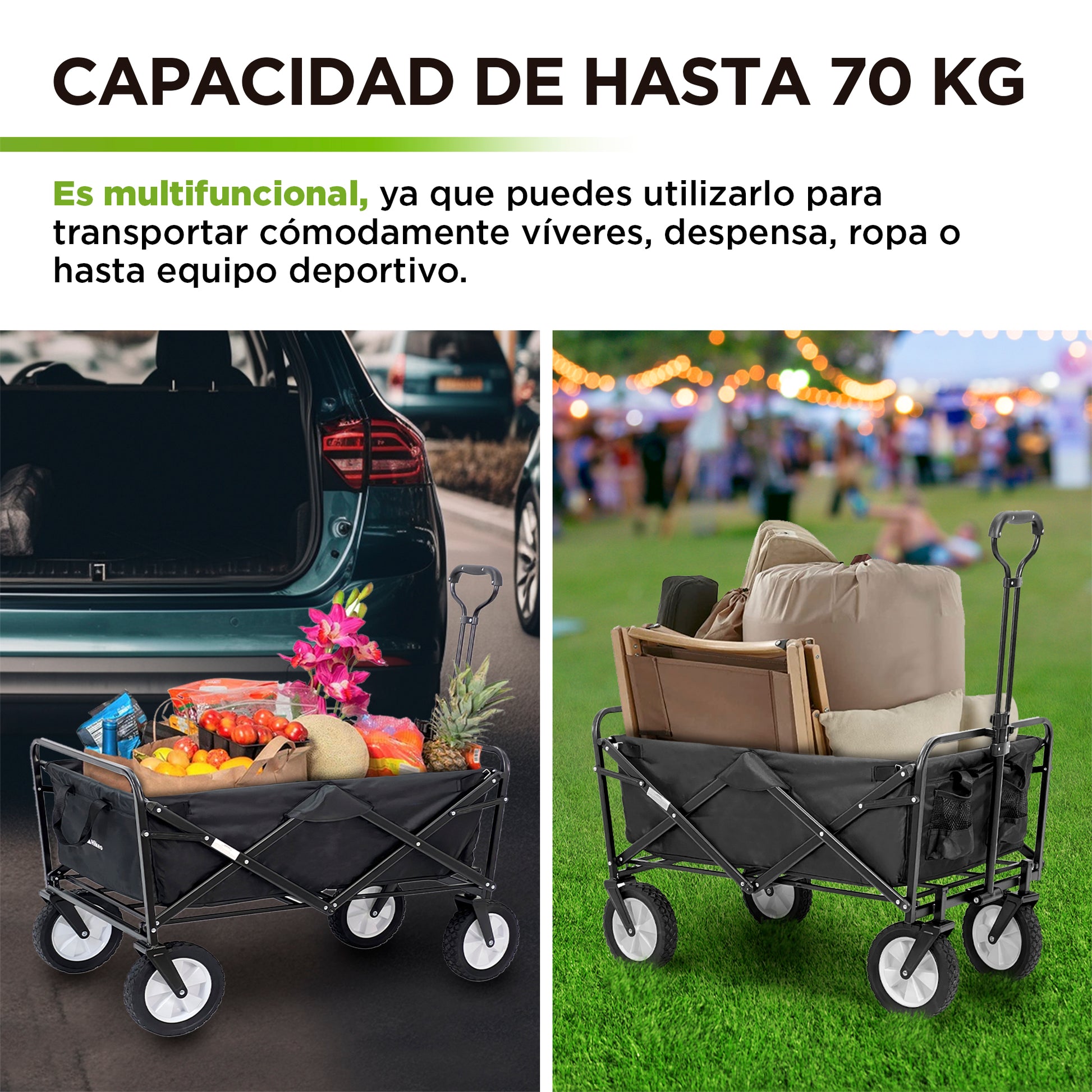 • CAPACIDAD DE 70 KG, PARA CAMPING, HIKING, PICNICS Y MÁS: Te va a encantar este carrito por su multifuncionalidad, ya que puedes utilizarlo para llevar cómodamente tus víveres o despensa del supermercado a tu casa, o bien, tu ropa a la lavandería. Incluso, te sirve para mover equipo deportivo a donde quieras